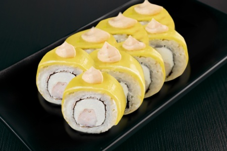 Рис, нори, тигровые креветки, сливочный сыр, сыр чеддер, спайси соус.