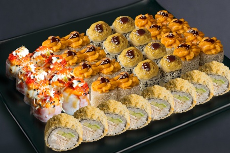 Гриль кани маки,гриль чикен краб,запеченный маменори с лососем.